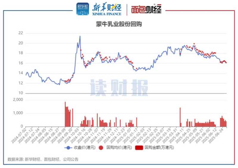 截至2025年7月2日,蒙牛乳业已累计回购2882.4万股,耗资4.54亿港元,期间回购最高价为19.9港元/股,回购最低价为12.24港元/股。其中,蒙牛乳业年内回购金额超1.9亿港元。