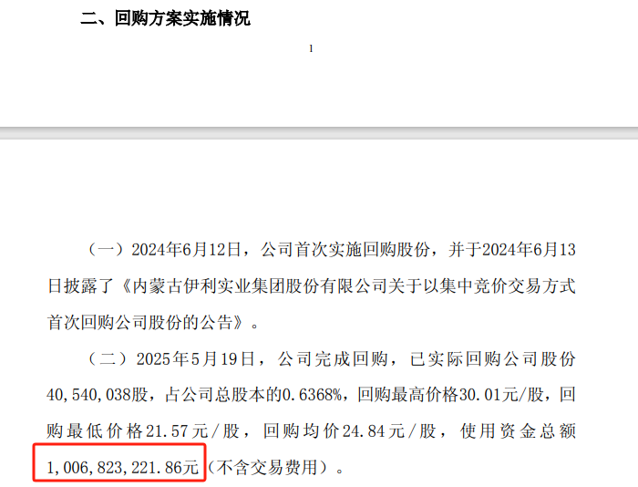 2025年5月20日,伊利股份发布股份回购实施结果暨股份变动的公告。2025年5月19日,公司完成回购,已实际回购公司股份约4054万股,占公司总股本的0.6368%,回购最高价格30.01元/股,回购最低价格21.57元/股,回购均价24.84元/股,使用资金总额约10.07亿元。其中,公司年内回购额超过2亿元。