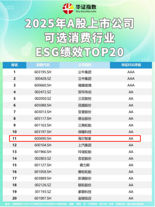 7月8日华证指数发布2025年A股上市公司ESG绩效TOP20,涵盖多行业。可选消费行业中,海尔智家作为家电业唯一上榜企业,获AA级评级,在环境、社会及公司治理方面表现优异。