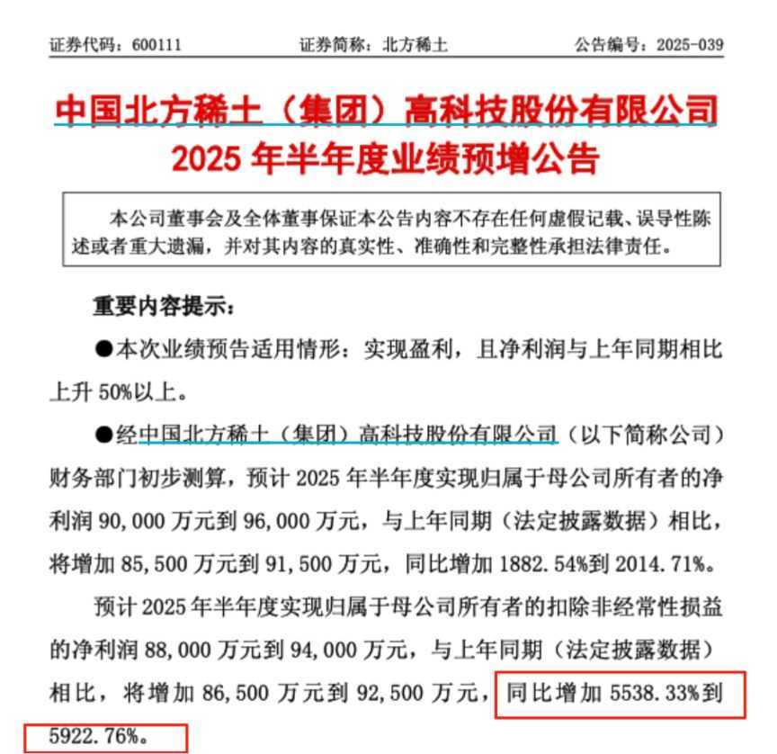 7月9日盘后,北方稀土公告,预计2025年半年度实现归母净利润9亿元到9.6亿元,同比增长1882.54%到2014.71%。预计实现归母扣非净利润8.8亿元到9.4亿元,同比增长5538.33%到5922.76%。