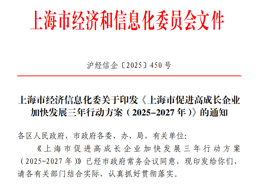 7月9日,上海市经济信息化委发布《上海市促进高成长企业加快发展三年行动方案(2025—2027年)》。力争新增2家以上估值超百亿美元的独角兽。方案围绕促进上海市高成长企业加速发展,实施七大行动,提出21条具体举措。