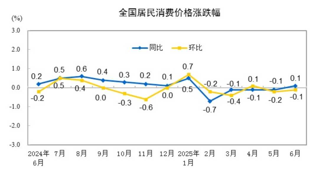 6月份,全国居民消费价格(CPI)同比结束连续4个月下降的态势,转为上涨0.1%。全国工业生产者出厂价格(PPI)同比下降3.6%,降幅比上月扩大0.3个百分点;环比下降0.4%,降幅与上月相同。