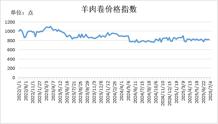 7月4日,羊肉卷价格指数报820.69点,较上期下跌0.92%,价格报47.6元/公斤,较上期下跌0.44元/公斤。