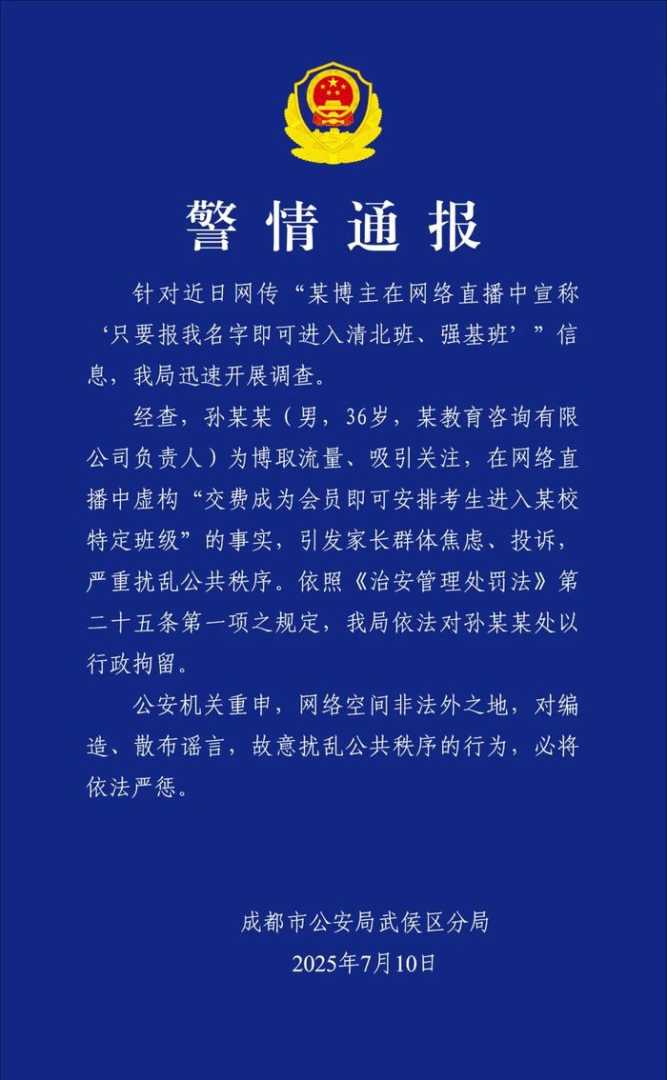 成都市公安局武侯区分局7月10日发布警情通报:针对近日网传“某博主在网络直播中宣称‘只要报我名字即可进入清北班、强基班’”信息,该局迅速开展调查。经查,孙某某(男,36岁,某教育咨询有限公司负责人)为博取流量、吸引关注,在网络直播中虛构“交费成为会员即可安排考生进入某校特定班级”的事实,这一行为引发家长群体焦虑、投诉,严重扰乱公共秩序。依照《治安管理处罚法》第二十五条第一项之规定,该局依法对孙某某处以行政拘留。