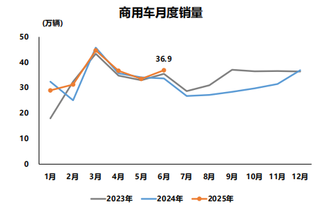 6月,全国商用车产销分别完成35.4万辆和36.9万辆,同比分别增长7.1%和9.5%。在商用车主要品种中,与5月相比,客车和货车产销均呈不同程度增长;与2024年同期相比,客车产销较快增长,货车产销微增。