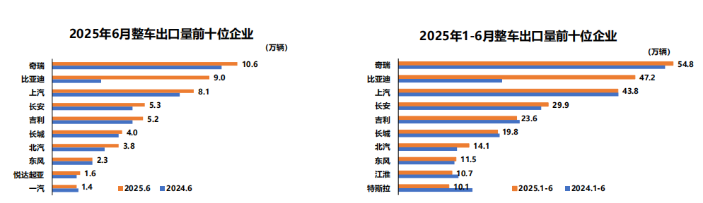 另外,在出口市场,1至6月,整车出口前十企业中,奇瑞出口量54.8万辆,同比增长3.1%,占总出口量的17.8%。与2024年同期相比,比亚迪出口增速最为显著,出口47.2万辆,同比增长1.3倍。