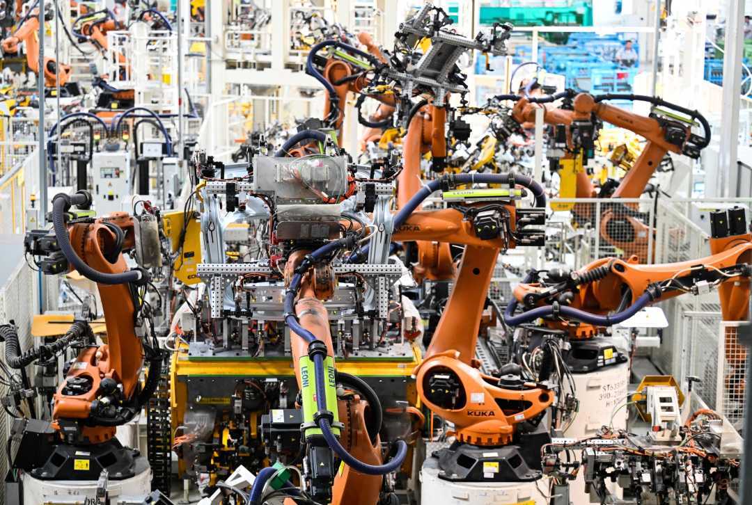 7月7日,机械臂等自动化生产设备在天津经济技术开发区一汽-大众华北基地焊装车间作业。新华社记者赵子硕摄