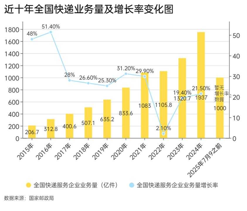 根据国家邮政局最新数据,截至7月9日,今年我国快递业务量已破1000亿件。