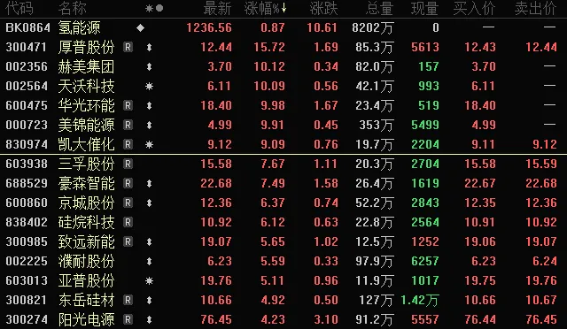 昨日(7月10日),A股氢能源板块异动明显。早盘,厚普股份一度“20cm”涨停,赫美集团连续两日涨停,华光环能更是连续6个涨停板,美锦能源、凯大催化、三孚股份、豪森智能等个股均在近期大幅上涨。