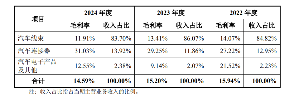 天海电子所在的汽车零部件行业的市场竞争现状是,不仅原材料采购价上升,公司在与汽车厂商交易时也给出较大的价格优惠以获取更多订单。这导致公司主营业务毛利率下降,2022-2024年分别为15.94%、15.20%、14.59%,连续两年下滑。占营收超80%的汽车线束产品毛利率下降得尤为剧烈,分别为14.07%、13.41%、11.91%。