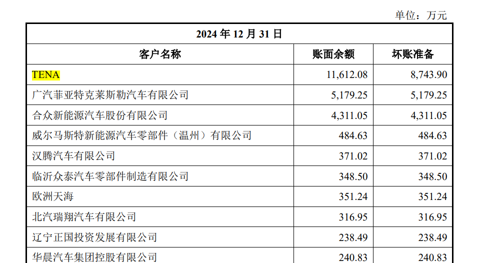 2024年,公司对TENA的1.2亿元应收账款中有8744万元计提坏账准备,是坏账准备中最大数额的客户。