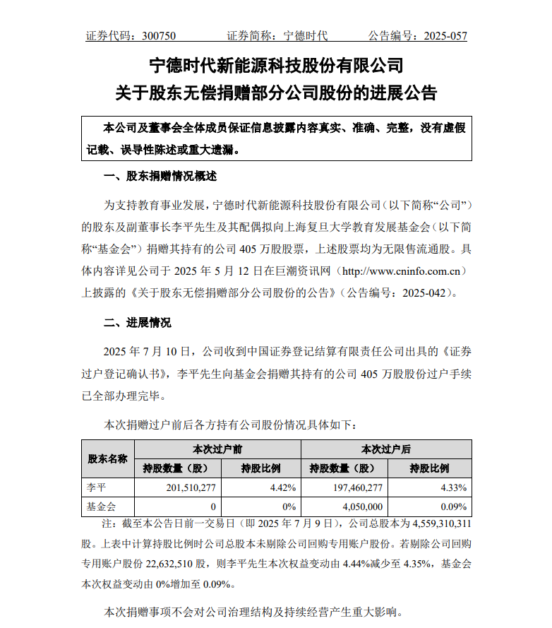 7月10日晚间,宁德时代副董事长李平及其配偶拟向上海复旦大学教育发展基金会捐赠405万股股票,估值超11亿元。捐赠后李平持股比例降至4.33%,基金会持股增至0.09%。公司强调捐赠不会对治理结构及持续经营产生重大影响。