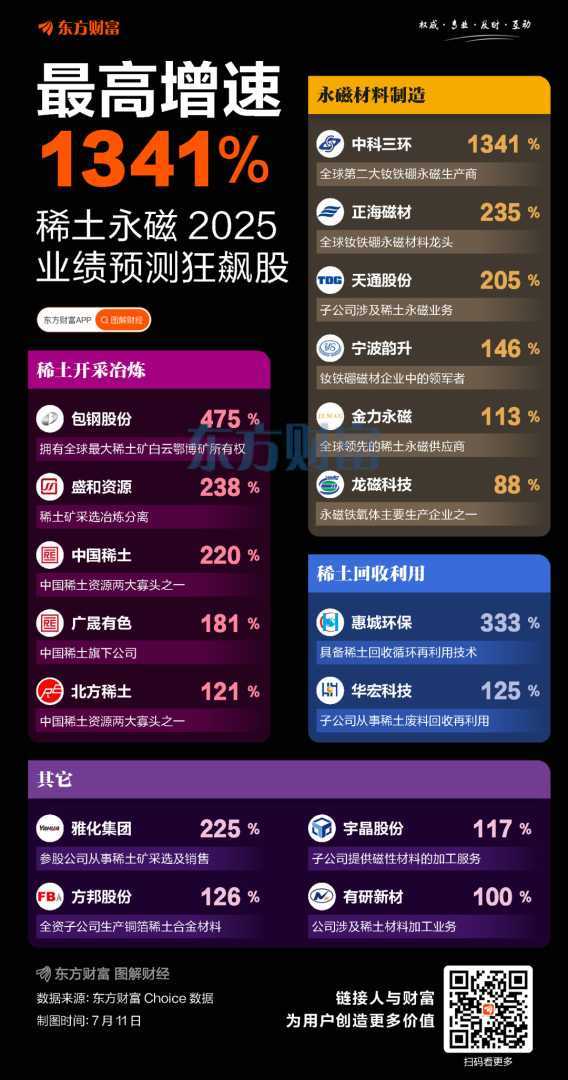 有机构表示,在“类供改”政策催化叠加“大国利器”地位的共同催化下,稀土永磁概念业绩景气度值得期待。从机构的业绩预测来看,不少个股2025年全年业绩有望高增长,比如中科三环2025年业绩预计增长1341%;包钢股份业绩预计增长475%;盛和资源、正海磁材、中国稀土、广晟有色、宁波韵升、北方稀土2025年全年业绩同样有望翻倍。
