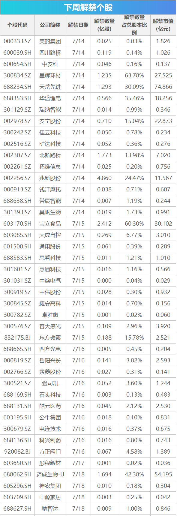 Wind数据统计显示,下周共有42家公司限售股陆续解禁,按7月11日收盘价计算,解禁总市值超260亿元。按7月11日收盘价计算,解禁市值居前三位的是:天岳先进(74.87亿元)、迈威生物-U(54.20亿元)、宝立食品(30.10亿元)。从个股的解禁量看,解禁股数居前三位的是:宝立食品(2.41亿股)、北新路桥(1.77亿股)、迈威生物-U(1.69亿股)。