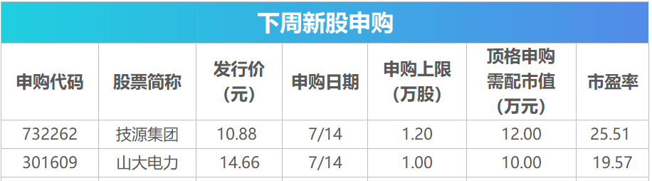 Wind数据显示,下周将有2只新股发行,其中沪市主板有1只,创业板有1只,合计发行约9073万股,预计合计募资12.36亿元,为新股焦点。
