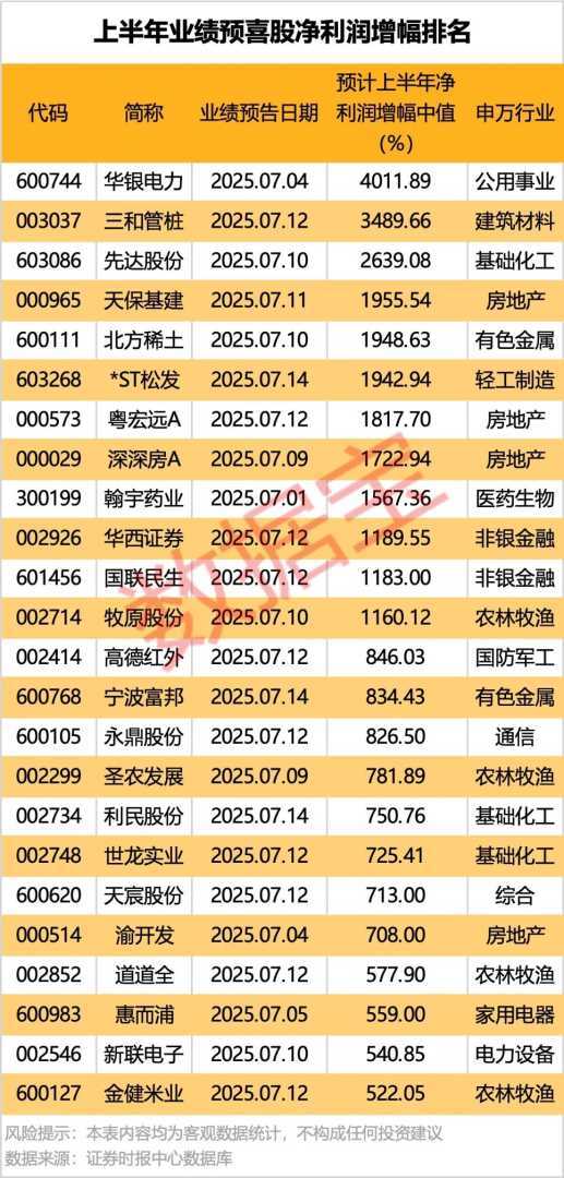 截至7月14日,513家公司公布2025年上半年业绩预告,预增和预盈公司合计占比58.09%,151家公司净利润增幅超100%,华银电力等12家公司增幅超10倍。