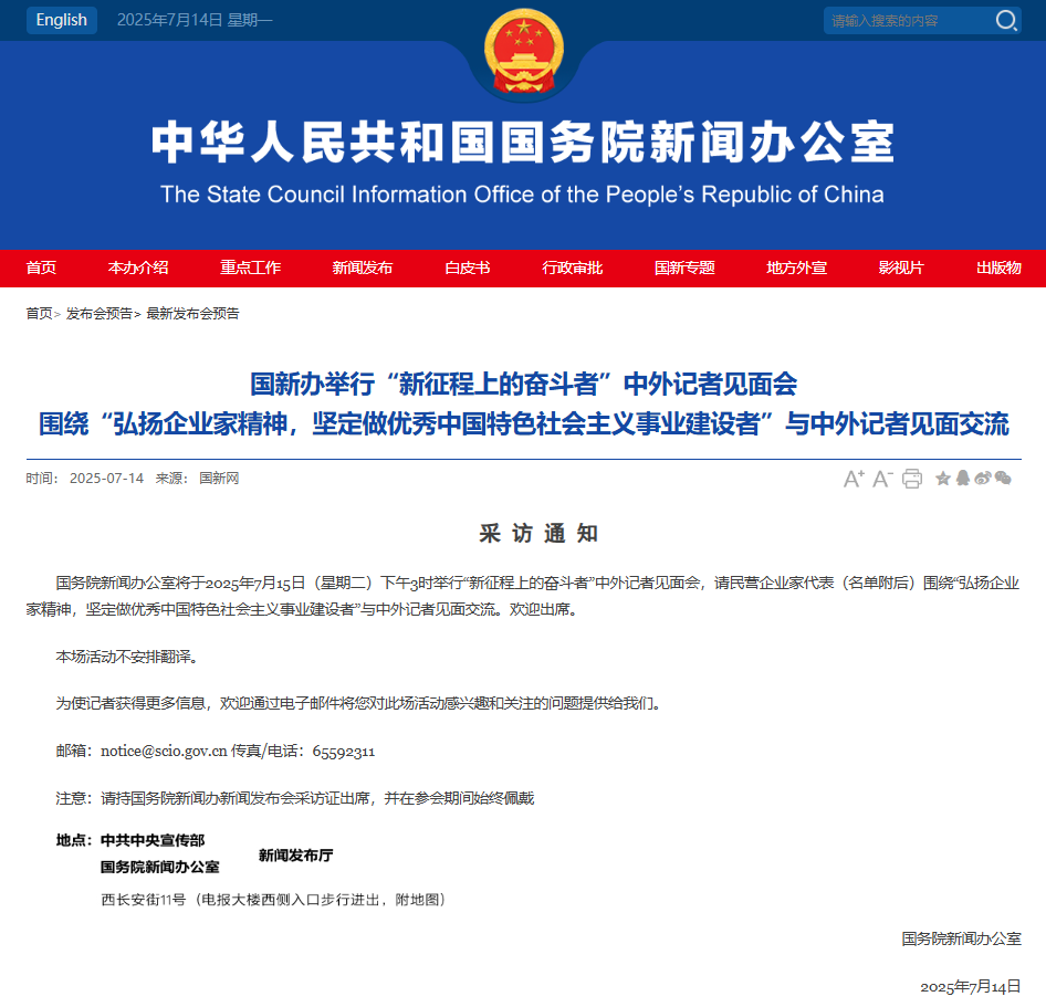 据国新网7月14日消息,国务院新闻办公室将于2025年7月15日(星期二)下午3时举行“新征程上的奋斗者”中外记者见面会,此次见面会聚焦于民营企业家,请民营企业家代表围绕“弘扬企业家精神,坚定做优秀中国特色社会主义事业建设者”与中外记者见面交流,这体现了对企业家精神的重视与弘扬。