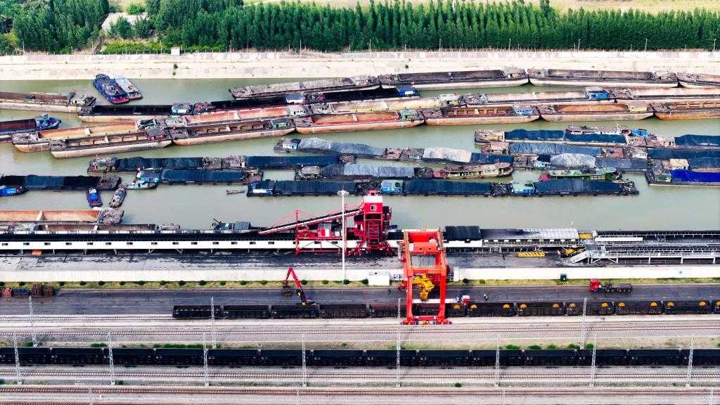 6月8日,济宁港航梁山港,船舶停靠等待装运煤炭(无人机照片)。新华社记者郭绪雷摄