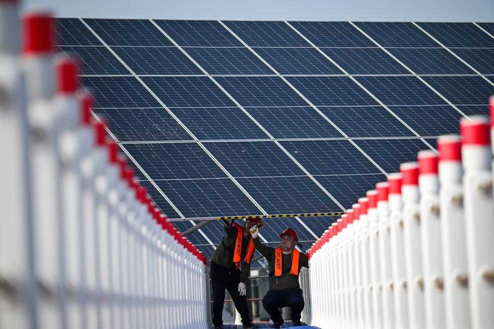 7月10日,国家能源集团天津龙源新能源有限公司渤化光伏电站,工作人员在检查光伏发电板。新华社记者赵子硕摄