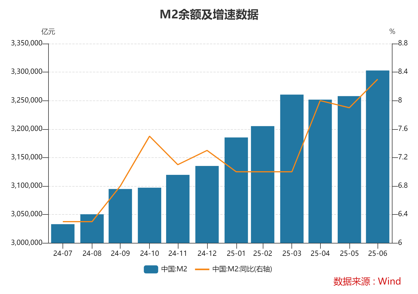 6月末,M2余额为330.29万亿元,同比增长8.3%,比上月高0.4个百分点。