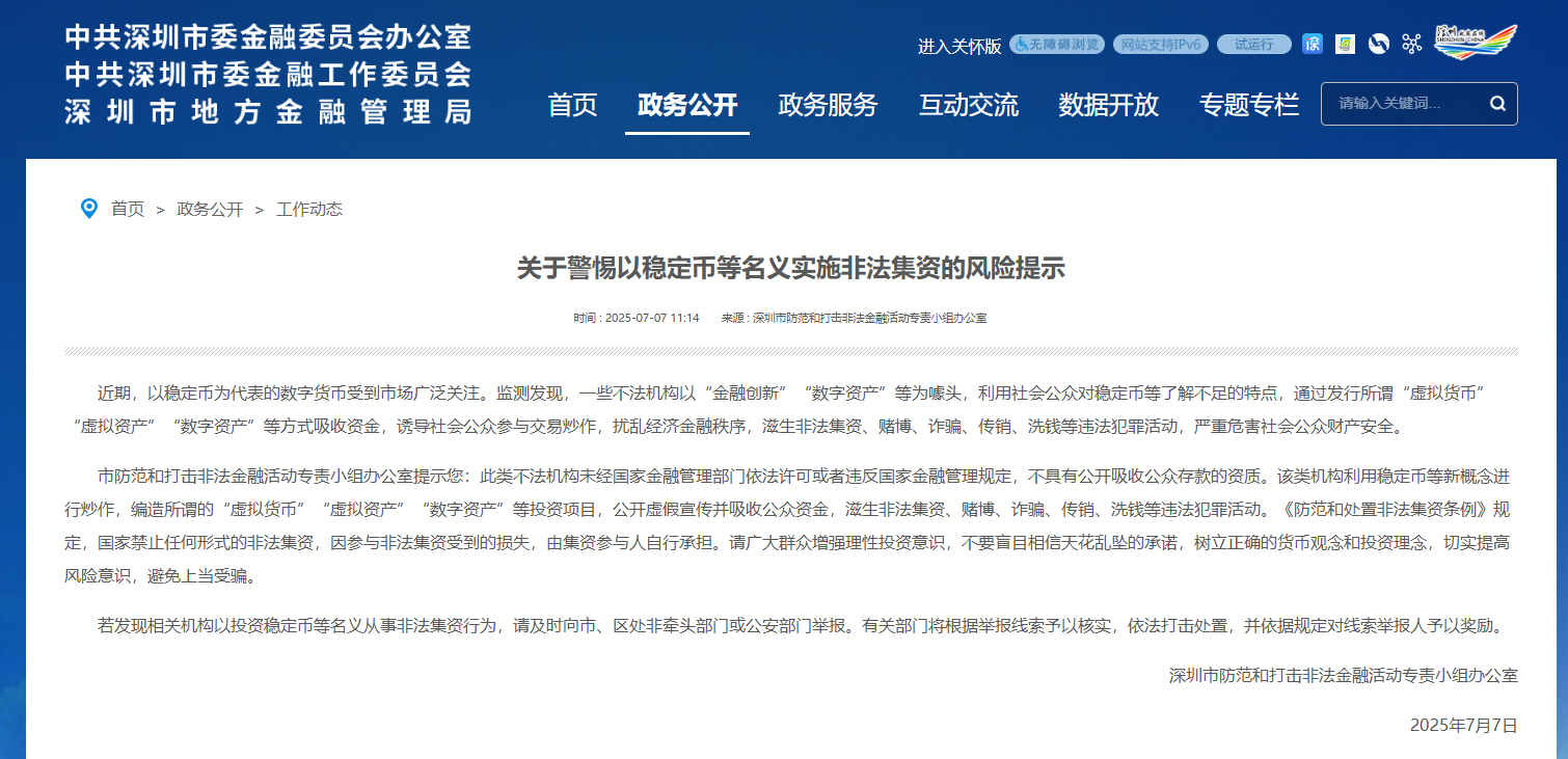 进入7月以来,北京、深圳等多地金融部门接连发布风险警示公告,着重强调 “稳定币” 正被违法分子利用,成为实施非法集资等犯罪活动的幌子,其潜在风险值得高度警惕。