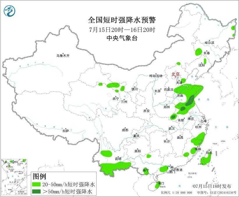 预计7月15日20时至16日20时,黄淮、江淮等地的部分地区将有8级以上雷暴大风或冰雹天气,其中,山东中东部和南部、江苏北部等地的部分地区将有10级以上雷暴大风,最大风力可达11级以上;黄淮、江淮、江南地区东部、西南地区南部、东北地区东部、西北地区东北部等地的部分地区将有小时雨量大于20毫米的短时强降水天气,其中,山东中东部和南部、河南南部、安徽北部、江苏北部等地的部分地区小时雨量大于50毫米,最大可达60毫米以上。预计,强对流的主要影响时段为今天后半夜至明天白天。