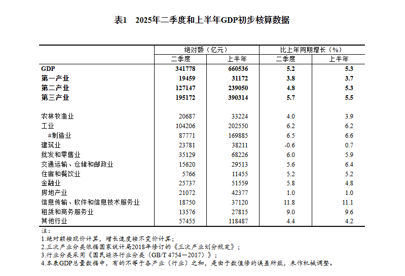 国家统计局发布数据显示,今年二季度国内生产总值绝对额达341778亿元,同比增长5.2%。其中,第三产业增加值195172亿元,同比增长5.7%,成为经济增长的重要驱动力。
