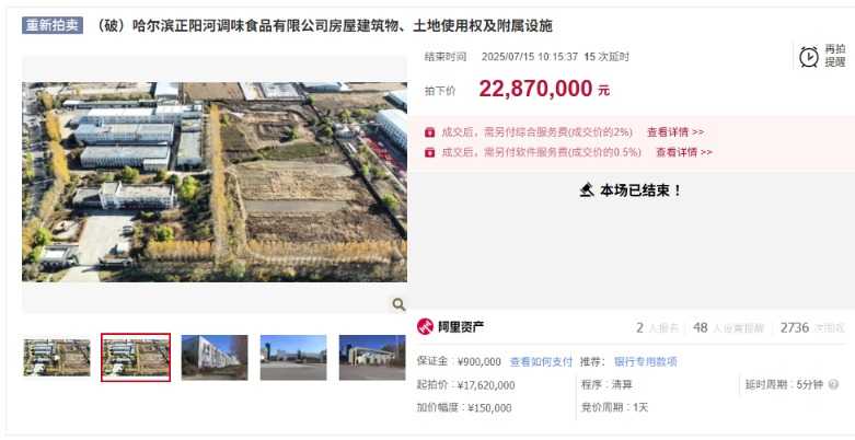 红星资本局7月16日消息,近日,哈尔滨正阳河调味食品有限公司(下称“正阳河公司”)房屋建筑物、土地使用权及附属设施在阿里资产平台上架拍卖,被人以2287万元拍下。