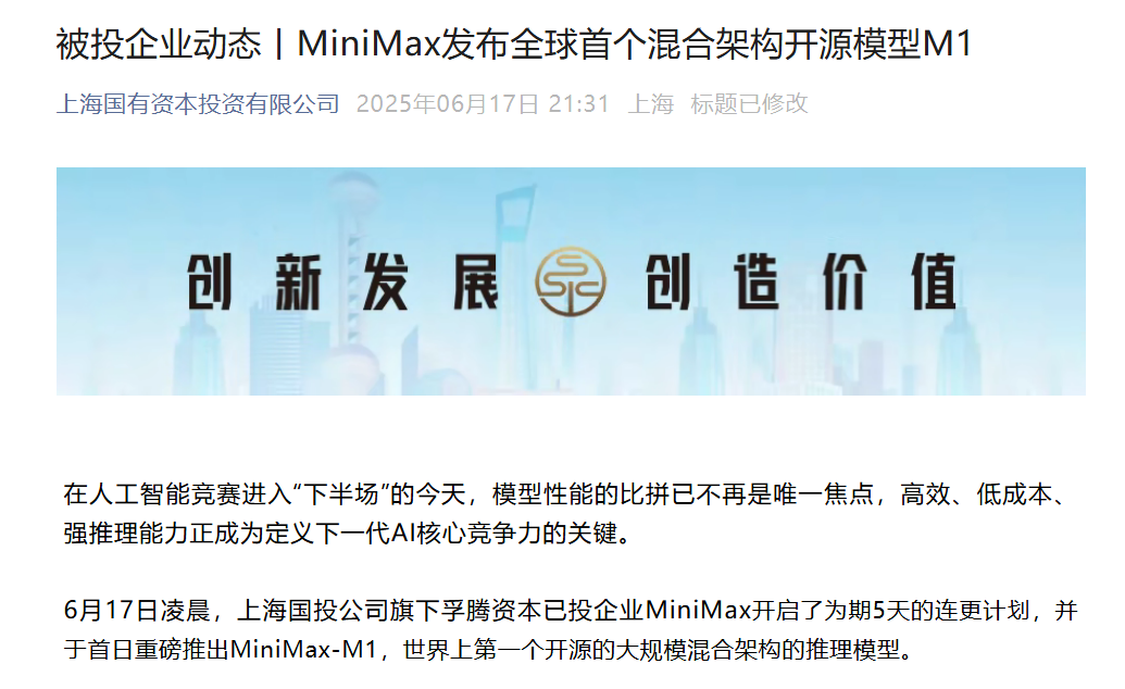 值得一提的是,6月17日,上海国有资本投资有限公司发文称,旗下孚腾资本已投企业MiniMax开启连更计划,首日推出MiniMax-M1——世界上第一个开源的大规模混合架构推理模型。