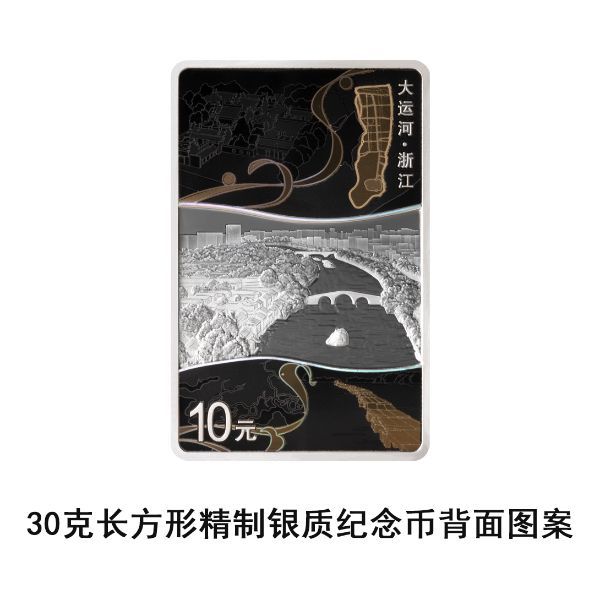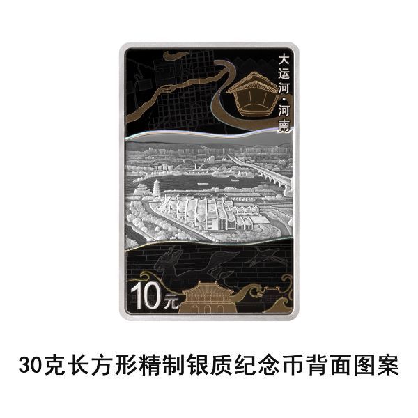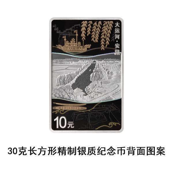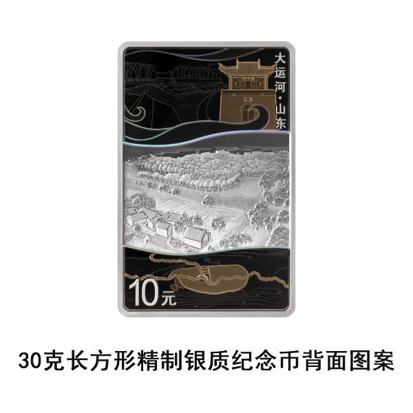 30克长方形银质纪念币分别以北京什刹海万宁桥、天津三岔河口、河北沧州运河等为主要场景,并刊相应地区名称及面额,体现大运河沿线文化。