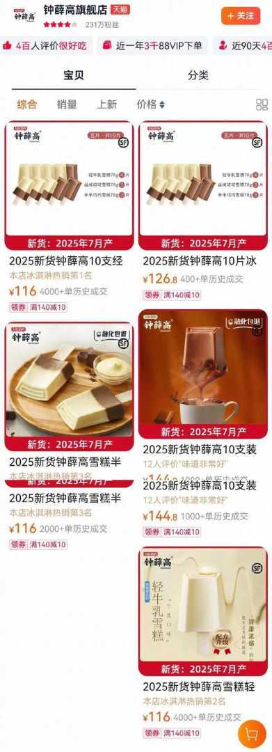 在钟薛高的线上销售平台,淘宝旗舰店只有5个链接,在售的只有轻牛乳、可可、半巧这3种口味,其中销量最高的链接是3个口味的组合装,显示已售2000多件,但最近的评价是一周前,且只有2条,近一个月只有11条评价。而店铺现在几乎已经没有了“装修”,非常简单。