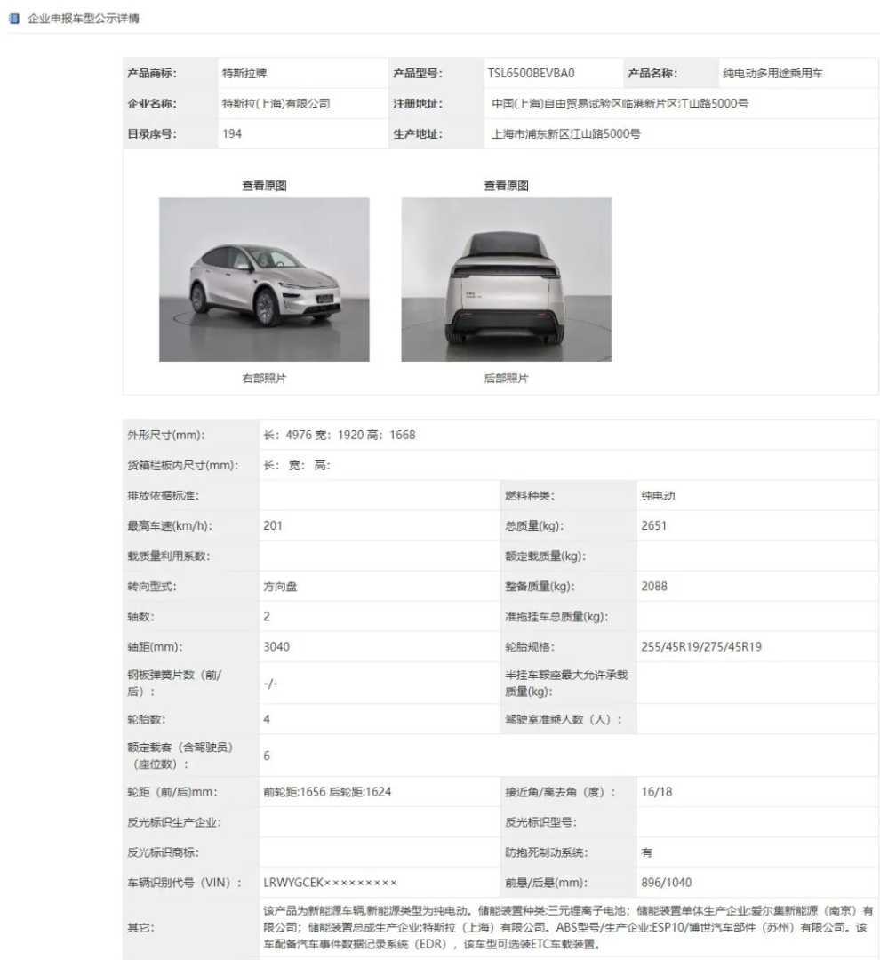 此外,工信部今日发布了《道路机动车辆生产企业及产品公告》(第397批)的车辆新产品公示清单,特斯拉纯电动多用途乘用车名列其中。据悉,该车型产品型号为TSL6500BEVBA0,为6座车型。
