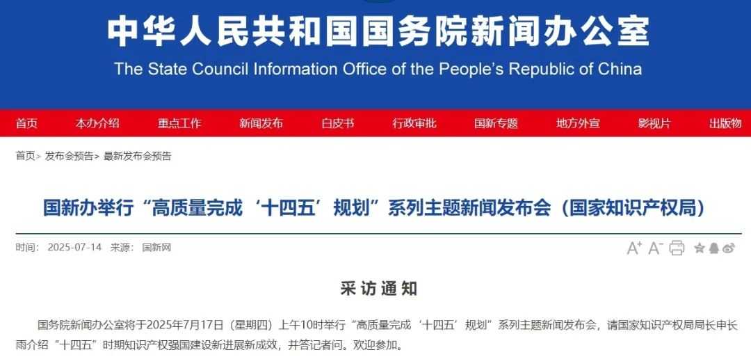2025年7月17日与18日,国新办将分别举行新闻发布会,介绍“十四五”时期知识产权强国建设新进展新成效以及商务高质量发展成就,并答记者问。