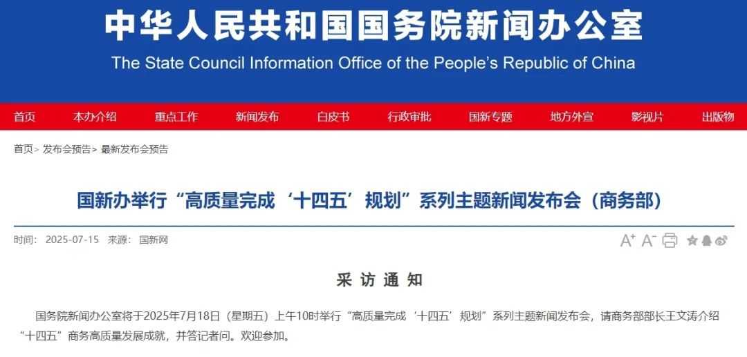 国务院新闻办公室将于2025年7月18日(星期五)上午10时举行“高质量完成‘十四五’规划”系列主题新闻发布会,请商务部部长王文涛介绍“十四五”商务高质量发展成就,并答记者问。