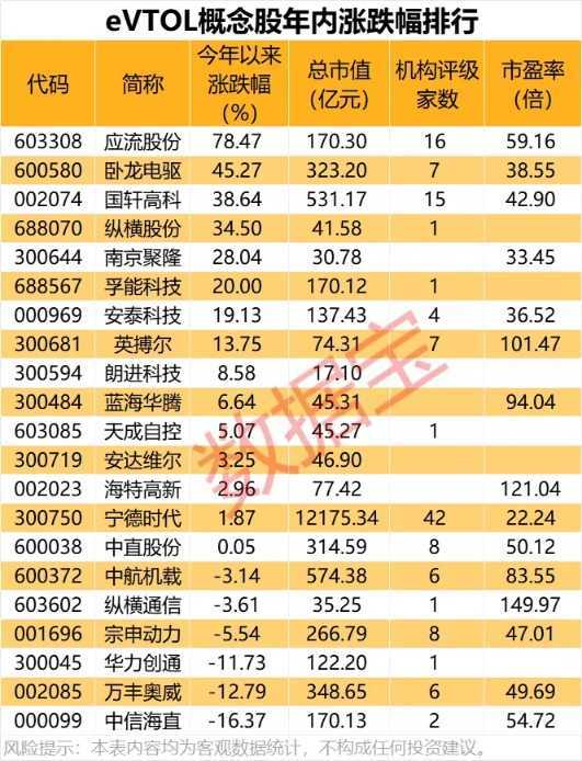 据数据宝统计,上市公司布局eVTOL产业链的个股共有21家,主要涉及整机制造、运营维护、航空电池与核心零部件等方面。从行情上来看,eVTOL概念股今年以来平均上涨12.05%,应流股份、卧龙电驱、国轩高科、纵横股份涨幅超过30%。