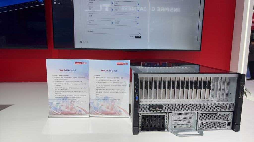 不过,联想集团展区展示了一台搭载16块H20芯片的联想服务器WA76160 G5。工作人员透露,英伟达还专门为此产品拍摄了Vlog视频。