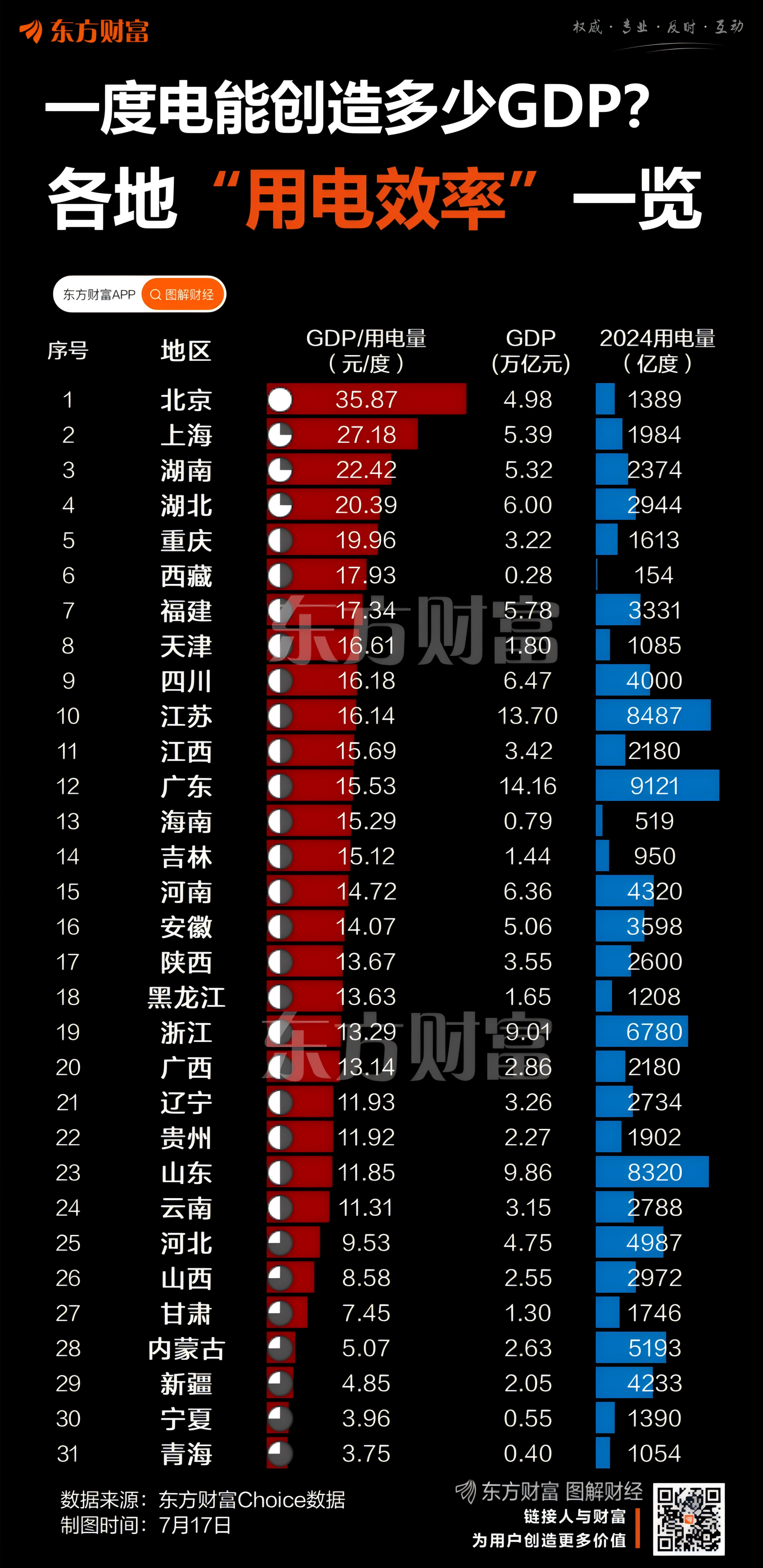 比较有意思的是,仅从用1度电能创造多少GDP的角度来看,上述用电大省的“用电效率”并不高,多排在全国中游。这一发现引发了关于能源利用效率与经济发展关系的深入思考。