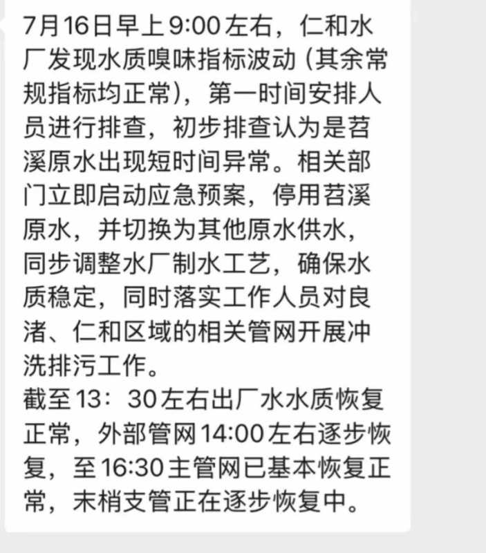 有业主向记者提供了物业服务群里的截图,内容显示:7月16日早上9时左右,仁和水厂发现水质嗅味指标波动(其余常规指标均正常),初步排查认为是苕溪原水出现短时间异常。