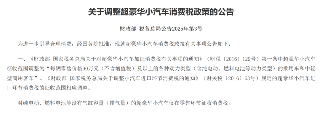 财政部、税务总局发布公告,调整超豪华小汽车消费税征收范围至每辆零售价格90万元及以上,纯电动等无气缸容量车型仅在零售环节征税,二手超豪华小汽车不征税,新规自2025年7月20日起执行。