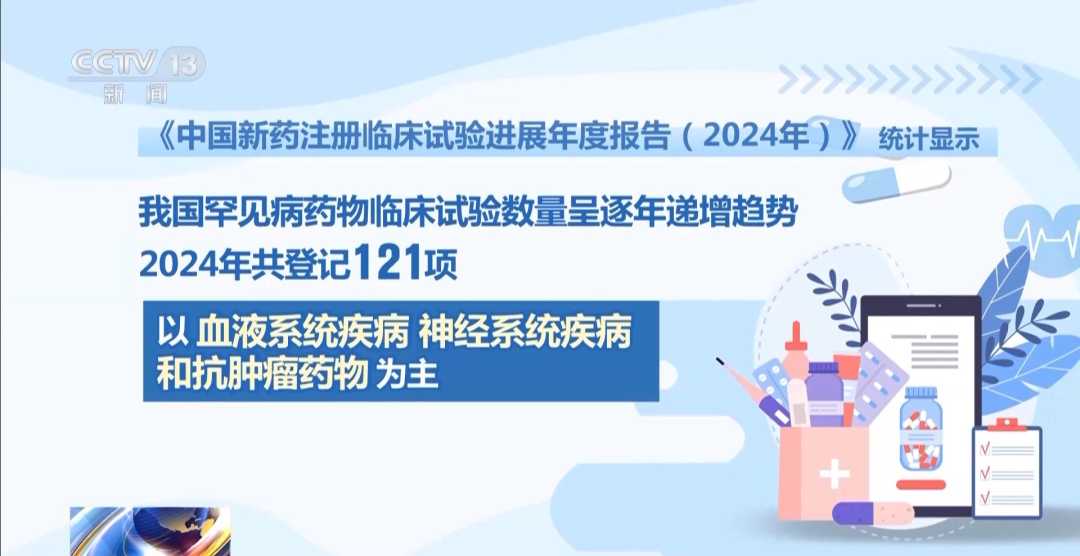 记者注意到,我国罕见病药物临床试验数量呈逐年递增趋势,2024年共登记121项,以血液系统疾病、神经系统疾病和抗肿瘤药物为主。