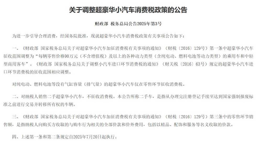 综合来看,本次调低超豪华小汽车消费税起征门槛,同时将新能源车纳入征收体系,体现了“油电同权”的导向。短期可能抑制90万-130万区间的新车需求,但长期利好国产新能源升级与二手车市场。
