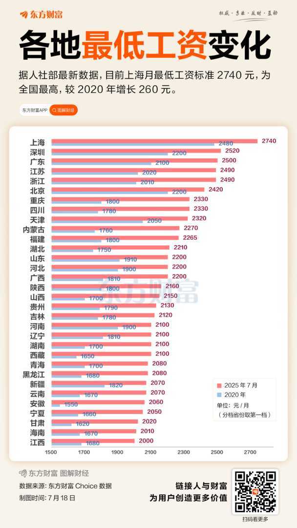 2025年以来,全国多地上调最低工资标准,包括重庆、四川等近10省份。广西、青海等地也提高标准,目前各省份最低工资均达或超2000元。上海以2740元领跑全国,广东紧随其后。