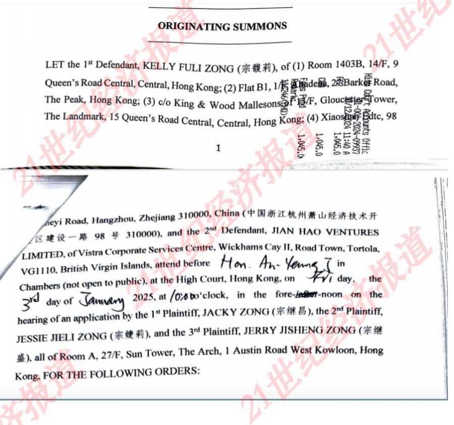 起诉书透露,原告宗继昌等三人早在2024年12月30日向香港高等法院递交originating summons(原诉传票),并已于2025年1月3日在香港高等法院内庭(非公开审理)这一案件。