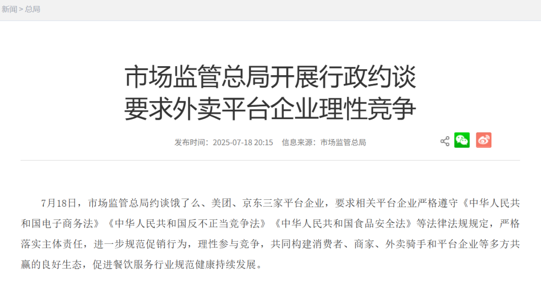 7月18日,国家市场监管总局约谈饿了么、美团、京东三家平台企业,要求相关平台企业严格遵守《中华人民共和国电子商务法》《中华人民共和国反不正当竞争法》《中华人民共和国食品安全法》等法律法规规定,严格落实主体责任,进一步规范促销行为,理性参与竞争,共同构建消费者、商家、外卖骑手和平台企业等多方共赢的良好生态,促进餐饮服务行业规范健康持续发展。