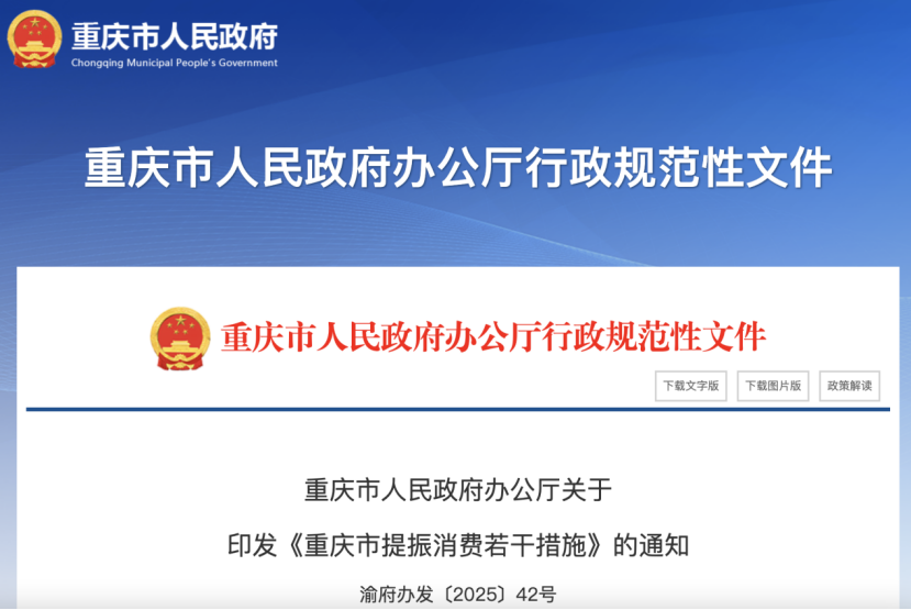 附全文:重庆市提振消费若干措施,为落实相关要求,结合实际,从促进居民就业增收(支持重点群体就业创业、多措并举促进居民增收、着力解决欠薪欠款问题)、保障居民消费能力(提高养老保障能力、加大生育养育保障力度、强化教育支撑、提高医疗保障能力、加强重点群体基本生活保障)、推动服务消费提质扩容(加快吸引外来消费、拓展文化和旅游消费、提振体育服务消费、促进住宿餐饮消费、发展“社区+”融合消费)、推动大宗消费更新升级(促进住房消费健康发展、释放汽车消费潜力、激发家居家电消费活力)、着力提升消费品质(加强消费品牌培育、加快发展新型消费、加力打造消费新场景、高质量举办促消费活动、提高内外贸一体化水平)、持续优化消费环境(营造放心消费环境、保障休息休假权益、完善城乡商贸流通体系、强化金融信贷支持、完善配套支持政策)等方面提出具体措施。