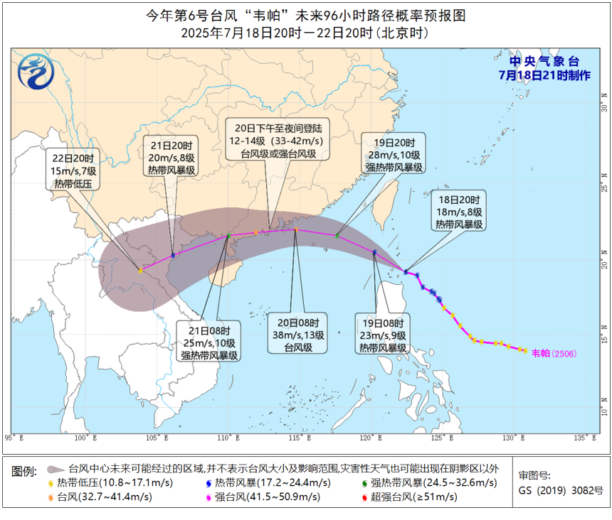 今年第6号台风“韦帕”7月18日20时中心位于距离广东江门市沿海东南方向约1050公里的洋面上,中心附近最大风力8级(18米/秒)。预计,“韦帕”将以每小时20~25公里的速度向西偏北方向移动,19日上午移入南海北部海面,逐渐向深圳到海南文昌一带沿海靠近,强度逐渐加强,并于20日下午至夜间在上述沿海登陆,此次台风对沿海地区可能产生较大影响。
