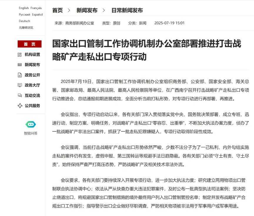 2025年7月19日,国家出口管制工作协调机制办公室组织多部门召开打击战略矿产走私出口专项行动推进会,总结前期进展,分析打私形势,要求持续深入开展专项行动,严防战略矿产非法外流。
