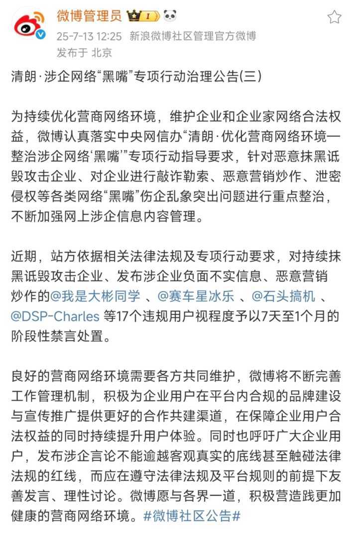近期,微博管理员对持续抹黑诋毁攻击企业、发布涉企业负面不实信息、恶意营销炒作的@我是大彬同学等17个违规用户予以阶段性禁言处置。