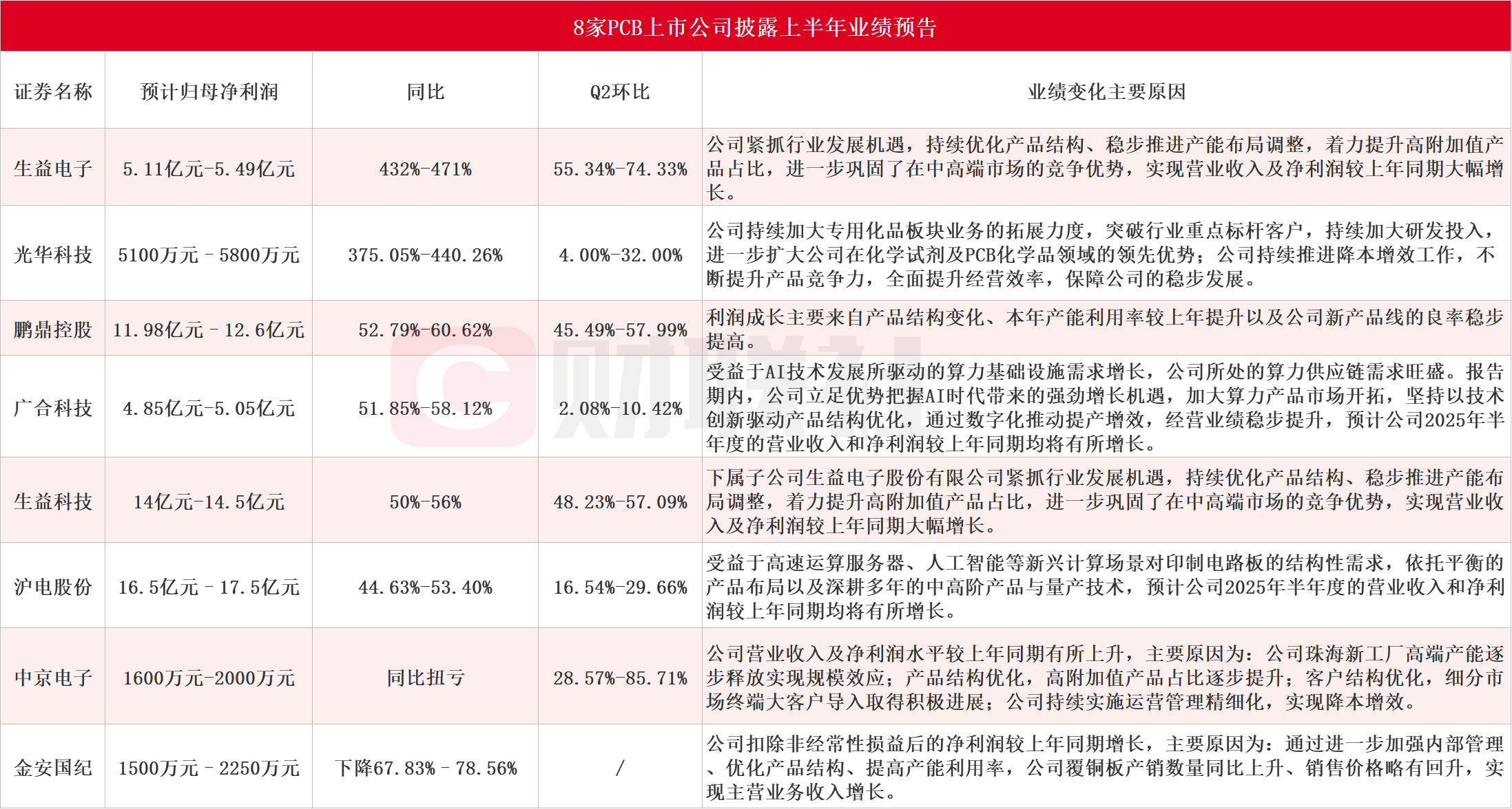 截至发稿,8家PCB上市公司披露上半年业绩预告,生益电子、光华科技等净利同比预增显著,多家企业Q2净利环比亦实现增长,PCB行业展现强劲发展势头。