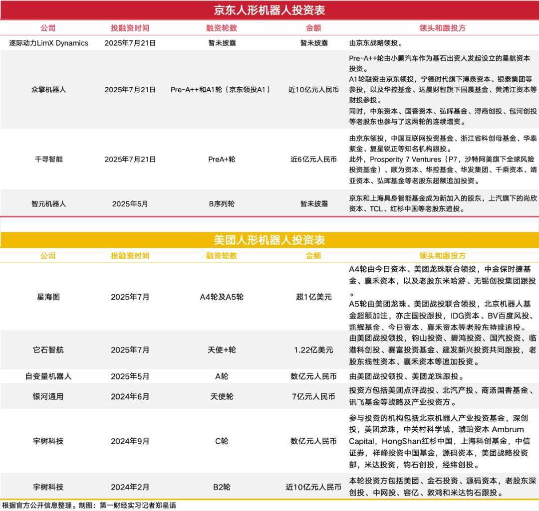 京东和美团,在机器人投资赛道“打”起来了。7月21日,京东在人形机器人赛道接连完成三笔融资布局。7月伊始,在两笔超过1亿美元的人形机器人企业融资中,美团也都以领投或联合领投的身份出现。